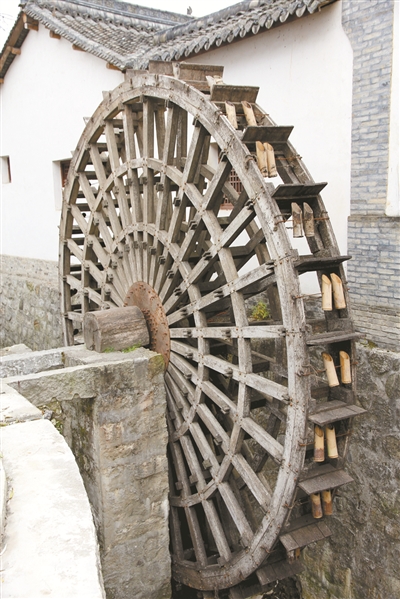 古镇一侧,水车吱吱地转动着,不知疲倦地清唱着华阳小调,一筒筒清澈明净的溪水被转动的水车提起来,又哗哗地流进上方的导水槽里,生动地再现了这里的农耕文明。在古镇的一端,是二水交汇之处,因地就势建起了船头形的广场,两条小河静静地流淌着,仿佛在述说着岁月的久远和历史的兴衰。