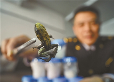 据介绍,继2015年9月9日首次截获黄带箭毒蛙后,2016年4月15日,北京出入境检验检疫局再次截获全球毒性最强物种之一——箭毒蛙活体,共计10个,经鉴定分属三种:钴蓝箭毒蛙、火焰箭毒蛙和黄金箭毒蛙。此次截获为国检人员在对入境EMS国际快件开展现场查验时发现的。该邮包寄自波兰,申报为“衣服、礼物”的可疑邮包。经开箱查验,发现邮包内含10个塑料圆柱盒,均装有蛙类动物活体,为躲避X光机查验塑料圆柱盒外有衣服、报纸等包装物包裹伪装。国检人员遂依法对这批禁止邮寄进境物进行了截留处理,并立即送往中国科学院动物研究所鉴定。新华社发