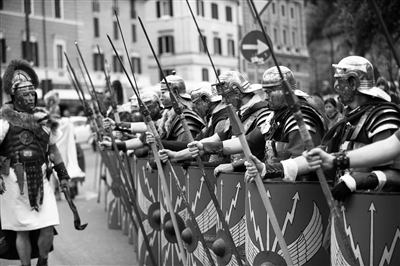 4月24日,在意大利罗马斗兽场,人们装扮成古罗马士兵参加罗马建城2769年庆祝游行。当日,人们穿戴古罗马时期服饰,围绕大竞技场、威尼斯广场、罗马广场和斗兽场,参加罗马建城2769年庆祝游行。相传罗马建城日为公元前753年4月21日。