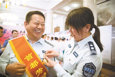 值得一提的是,会前,西城区领导还与10位劳模代表进行了座谈。劳模代表中既有像北京基业达电气有限公司工艺员刘军一样年轻的在职劳模,也有像付连成、车红等仍在发挥先锋带头作用的退休劳模。10位劳模代表与区领导围绕城市建设、劳模作用发挥等方面展开交谈。劳模们纷纷表示,将立足本职,用实际行动影响和带动广大职工群众,为推动西城发展做出贡献。图为西城区城管队员在为今年获得表彰的同事佩戴奖章。