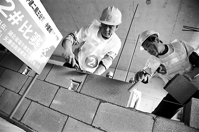 “结构砌筑看着简单,跟搭积木似的,但里头学问可多了。”砌筑大赛一名评委向记者介绍,随着施工工艺不断更新,空心砌块由于重量轻、隔音保温等优秀性能材料,成为目前项目住宅内部隔墙的主要材料,一道墙如何把建筑钢筋埋在砌块中,整体如何布局,同时最大化保证结构墙稳定,并做到节约用材,这全都要靠技术来支撑。