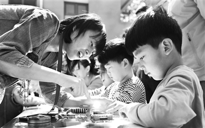 近日,东城区第二幼儿园携手东城科技馆、崇外街道开展“大手拉小手,科学玩中学”亲子趣味科学体验活动。在老师的指导下,孩子们和爸爸、妈妈共同完成“小鸟进笼”、“水果发电”等有趣的科学实验,使孩子在寓教于乐中,提高了探究科学奥秘的兴趣。本报记者 万玉藻 摄影报道