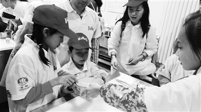 7岁的杨康小朋友来自如意园社区,他学着工作人员的样子,有模有样地打鸡蛋、和面粉,然后利用微波炉,将搅拌好的面糊加热40秒钟。随着加热时间结束,“叮”的一声,微波蛋糕就做好了。杨康高兴地拿着自己制作的蛋糕,分享给身边的家长和小朋友们。