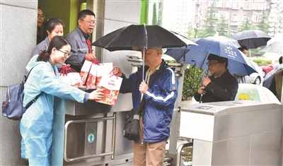 此时,外面小雨转成了中雨。我和办公室其他三个小姐妹一起来到公司大门口时,发现已经有很多市民撑着伞在等候了。一切都按计划进行着。特别巧的是,在前来参观的队伍里,还遇见了我的邻居。这种情况的偶遇,我们感到格外亲切。