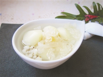 做法:薏苡仁30克,百合30克,荸荠250克。将薏苡仁、百合洗净用温水发透荸荠去皮、洗净从中间切开;将荸荠、薏苡仁、百合同入瓦锅内加入清水适量,置武火上浇沸;再用文火炖煮45分钟可。