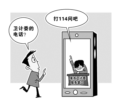 近日,在河南洛阳市一档电视问政类节目中,洛阳市卫生和计划生育委员会走进了直播间接受群众问政。然而节目现场播放的一条短片让观众大跌眼镜,视频显示:有记者打电话到洛阳市卫计委行政服务大厅,想咨询卫计委医护人员执业资格年审问题,服务大厅工作人员给出的答复是:对此不清楚,并表示卫计委的电话“在这里没有登记,你打114问吧”。(5月21日央广网)□朱慧卿