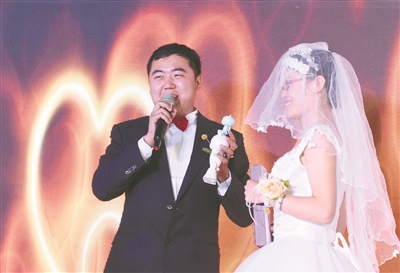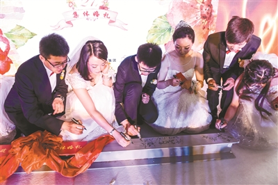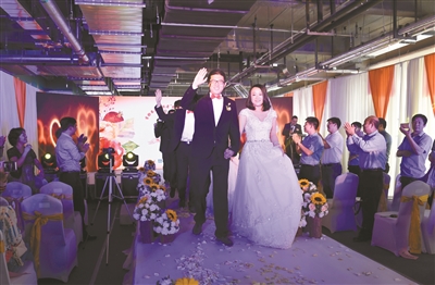 在婚礼现场,五对新人将自己的名字留在了一根钢梁上,这根钢梁将用于国贸三期B项目顶端停机坪的建设。典礼上,五对新人向全体首都建设者发出倡议,弘扬“工匠精神”,专注做好每一项工作,争当岗位先锋;坚守产品质量,用勤劳和汗水为城市建设满意工程。