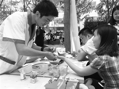 “这是免费测血压吗?”一位穿蓝色格子衣服的女职工走到展台前询问,在得到肯定的答复后,笑着坐了下来,“那给我测一个吧,我觉得血压有点低。”和她一起的几个同事也围了过来,说自己也想测。