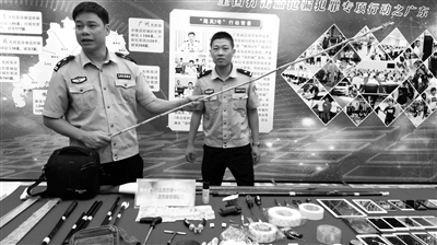 5月17日至23日,广东警方开展为期一周的“飓风7号”打击“盗抢骗”犯罪系列专案收网行动,抓获盗窃、抢劫、抢夺、诈骗和掩饰隐瞒犯罪所得等5类犯罪嫌疑人1043名,破案1736起,追缴赃款赃物价值294.2万元。图为民警演示犯罪嫌疑人如何用钓鱼竿盗取平板电脑。新华社发