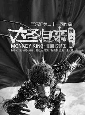 根据电影《西游记之大圣归来》改编的舞台剧《大圣归来》本周末将进剧场。与电影相比,舞台剧《大圣归来》增加了花果山生活的情节,融合戏曲、武术、舞蹈、杂技、魔术于剧情之中,运用声光电等技术打造绚丽舞台效果。