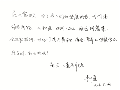 据了解,目前与北京洪福环宇餐饮有限公司合作的蔬菜基地共有30多家,产出的蔬菜、杂粮均为绿色、无公害产品。而独立的蔬菜收购环节、食品加工环节、配送运输环节等,都让李广莲有信心对孩子们吃的食品负责。
