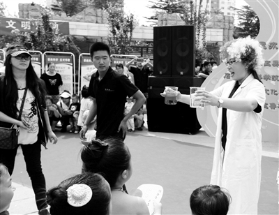 29日,在石景山鲁谷社区,实验师把几种带颜色的药水加在一起,会有烟雾喷出。当日,石景山区“崇尚科学我先行,反对邪教当先锋”为主题的专场活动举行,这些看似不亚于魔术表演的精彩实验,用科学知识揭穿了“伪科学”的面目。本报记者 陈艺 摄影报道