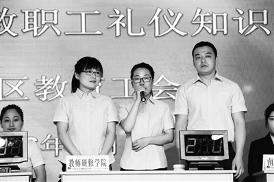 郝纪东说,礼仪知识竞赛活动是区教育工会师德建设中的重要一部分,活动不仅完善了教职工的礼仪规范,更打造了一支崇德修身、敬业爱生、自强奉献、勇于创新的教职工队伍。图为教职工礼仪知识竞赛现场。