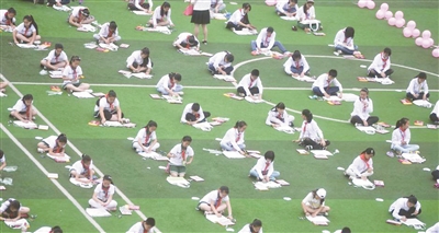 5月31日,重庆璧山100余名学生在足球场上进行手绘环保袋大赛,学生利用五颜六色的画笔在环保袋上描绘出心中的绿色环保画面。通过手绘比赛增强学生环保意识,同时也呼吁更多的市民环保出行。
