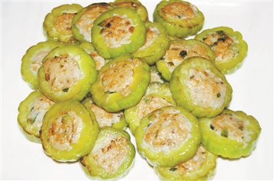 做法:苦瓜切段,掏去瓤;肉馅放盐,鸡精,少许生抽,用手抓匀,塞进苦瓜里;热锅冷油,放苦瓜下去,两面都煎好以后,放少许生抽,糖,水,盖上锅盖,不用翻动。