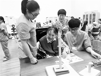 “王奶奶,您知道该怎么摆好这块积木吗?”上周五,在石景山区八角街道养老照料中心康复治疗师的指导下,80岁的王淑琴老人认真地“玩”着一组彩色积木。去年4月,王淑琴老人因脑出血导致偏瘫,生活基本不能自理,为了让她得到更好的照顾,家人将她送到离家不远的八角街道养老照料中心,在康复治疗师的精心照料下,如今,王淑琴老人的身体状况明显好转。在这里,像王淑琴一样得到呵护的半自理或完全不能自理老人还有很多,他们都是石景山区幸福养老“三边”工程的受益者。据了解,“十三五”期间,石景山区养老床位建设将超前发展,每百名老人拥有床位数可达3.96张。