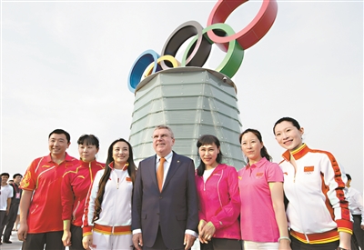 6月12日,北京奥林匹克塔命名暨奥运五环标志落成仪式在北京奥林匹克公园举行。这座位于北京中轴线上高246.8米的标志性建筑被正式命名为北京奥林匹克塔,并将永久性使用奥运五环标志。北京奥林匹克塔塔体由五座186米至246.8米高度不等的独立塔组合而成,建筑总面积18687平方米。图为国际奥委会主席巴赫(左四)在北京奥林匹克塔上与奥运冠军代表合影留念。据新华社