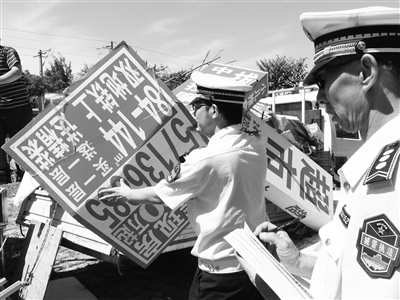 昨天,石景山城管对莲石路周边非法广告牌进行了拆除。莲石路是京城西部一条重要的东西走向道路,为保证道路沿线市容环境特别是交通安全,石景山城管会同交管部门严格查处乱设广告牌行为,一个多月以来,共取缔房地产非法广告牌近500块。本报记者 陈艺 摄影报道