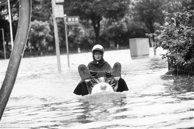 6月14日,广西柳州遭受暴雨袭击,全市多处路段积水,市民出行受到影响。图为市民在柳州市西江路积水中骑车出行。