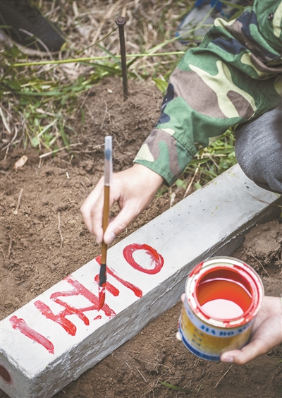 一到单位,大家麻利地装好干粮、水,带上罗盘、平板电脑、花杆等设备,便出发了。大约两个多小时的车程之后,汽车已经不能再往前走了,孙华彬一行五个人下了车,背起装备,开始徒步前进。他们每人都要背着二三十斤的东西,铁锨、砍刀等常用的工具必不可少,最重的就是水泥桩了。背着一个水泥桩子走山路一点也不轻松,赶上夏天中午的时候,背着它几分钟人就会大汗淋漓,调查队员们不得不轮流背。“身上的衣服刚在身上晾干,一会儿又全湿了。”孙华彬苦笑道。