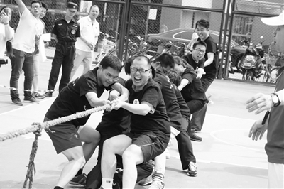 1分钟,双方僵持不下。平时在办公室看起来斯文平稳的职工,上了赛场个个英勇,气壮山河。日前,东城区体育馆路地区企事业单位拔河比赛举行,28支代表队近300名队员参赛,加油呐喊声震云宵。此次拔河比赛是体育馆路街道社区体育文化节系列活动之一,搭建了地区企事业单位沟通的桥梁,增强了单位职工的团队意识。