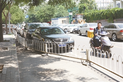 在西城区香炉营附近,记者看到,自行车道的宽度“缩水”到仅够一个行人通行;自行车道渐渐变成了免费停车场;就连自行车道与机动车道之间的交通护栏也没能幸免逃离被挪移的命运,骑车人不得不“借用”机动车道,在车流中小心穿行。