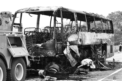 记者从湖南省宜章县政府部门了解到,据最新统计,6月26日发生在这个县境内的旅游大巴事故遇难人数上升为35人,其中两名小孩;11人住院治疗,其中4人重伤。车上载人一共为55名。6月26日10时20分左右,宜凤高速湖南省宜章县境内长村乡东溪大桥上一辆旅游大巴车,因撞到隔离带护栏发生油箱漏油起火,造成众多人员伤亡。司机已被控制。图为交通警察在湖南宜章县境内大巴事故现场查看。新华社发