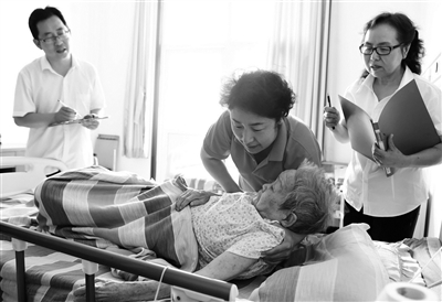 昨天,在房山区国爱老年人服务中心,护理员陈冬雪在考官的监督下,为卧床老人进行了翻身、换衣、剪指甲等服务。当日,该服务中心举办了护理员技能比武。此次参赛的护理员都是在自己分管的岗位上进行操作,避免老人因为考核而被重复“护理服务”。本报记者 陈艺 摄影报道