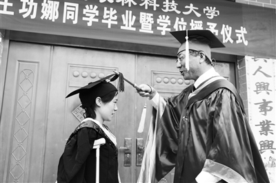 西北农林科技大学葡萄酒学院2010级本科生王功娜在2013年暑假因一次交通事故导致脊柱损伤,长期接受治疗,无法赴校学习。学校为王功娜组织网络教学和视频答辩,最终帮助她完成学业。由于王功娜行动不便,6月26日,西北农林科技大学校长孙其信一行驱车两百余公里来到陕西商洛市柞水县杏坪镇中山村,在王功娜家中为她拨穗并授予学位证书,举行了一场“一个人的毕业典礼”。新华社发