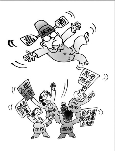 除了给高考“状元”赠送房产,近年来,“敕封”高考“状元”、请“状元”进行商业代言,让“状元”骑马游园为景区造势等炒作类报道也频频见诸报端。