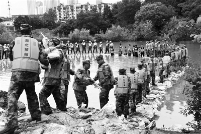 7月5日,湖北某预备役高炮师官兵在传递袋装石料,用于管涌处置围堰修筑。7月4日,长江武汉市青山区倒口湖发生管涌险情,经过湖北某预备役高炮师等单位的抢险人一夜奋战,截至5日12时,管涌处置围堰合龙成功,正加紧进一步处理。新华社发