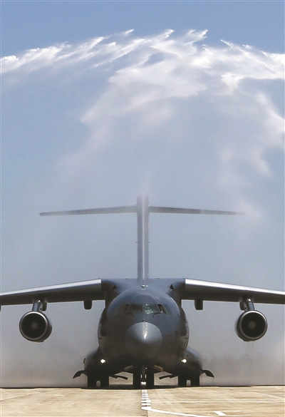 7月6日,中国空军运-20飞机授装接装仪式在空军航空兵某部举行。空军新闻发言人申进科表示,中国自主发展的运-20飞机正式列装空军航空兵部队,标志着空军战略投送能力迈出关键性一步。 申进科介绍,运-20飞机是空军战略性、标志性、引领性装备,是中国依靠自己力量研制的一种200吨级大型、多用途运输机,可在复杂气象条件下执行各种物资和人员的长距离航空运输任务。图为运-20飞机滑过水门,接受洗礼。新华社发