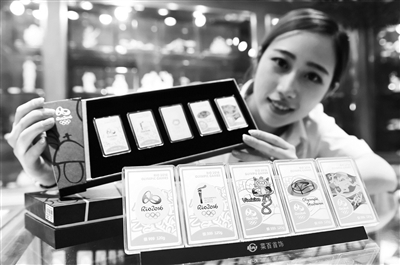 昨天,《里约2016年奥运会纪念金/银套组》新品在菜百公司上市。此次发行的纪念品由中国奥委会与国际奥委会授权发行。产品涵盖了里约奥运会吉祥物、会徽、运动项目等相关元素,将奥运会这一全球关注度高、影响力大的体育盛事与贵金属产品完美合璧。本报记者 陈艺 摄影报道