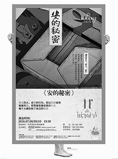 《安的秘密》给剧中人营造了一个困境,并把人放到一个特定的环境中去考察他们的反应。本剧以小女儿的死作为话剧中人物所经历的故事的开端。美丽善良的女主人公一个人去电影院看电影,却意外被人袭击……在追查事件原委的过程中,八年前的一段隐情若隐若现,此后越来越多让人动容的人与事物浮出水面。