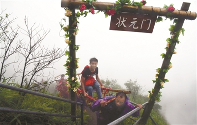 7月4日,广东清远,两名准大学生前几天填写完高考志愿后,相约来到金子山过“状元门”。他们花3000元雇用了当地4名老挑山工,将滑竿装扮成花轿的样子,抬他们上金子山,经过“探花门”、“榜眼门”与“状元门”,感受体验古代状元骑马游街的威风,祈愿自己成功踏入大学大门。