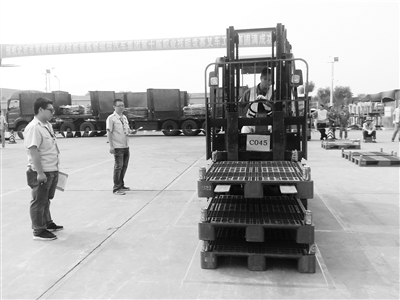 本报讯(记者 崔欣)叉车的叉头上绑上一支细钎,在指定范围内,从一边摘取挂在架子上的钥匙链,然后行驶到对面再挂到架子上。四分钟内,看谁能更快更准地完成;另一边,在平时堆放货物的拍子联合四角摆放上易拉罐饮料,用叉车运送到指定位置,4分钟内,高效保质完成6个……