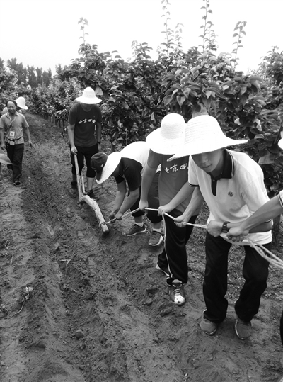 “前面的加把劲”;“扶得再稳一点”……7月12日上午,在北京农业职业学院试验田里,四中广外校区初二年级的李博涵、郑聪、张艺航等几个学生组成一组,在学院教师的指导下进行人生第一次犁地。