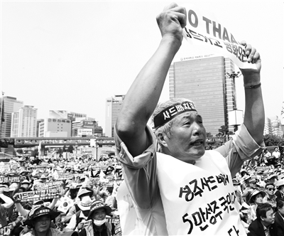 7月21日,在韩国首尔火车站广场,一名来自星州郡的男子在集会上高举反对部署“萨德”系统的标语。当日,两千余名“萨德”系统部署地星州郡的民众在首尔火车站广场举行集会,反对部署“萨德”系统。新华社发