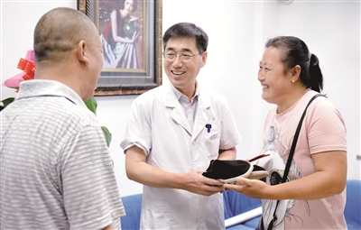 7月20日上午,山西患者刘虎庆和爱人郭富兰,来到北京垂杨柳医院,一见到泌尿科主任谷现恩大夫,马上就深深地鞠上一躬。刘虎庆拿出一双千层底布鞋说:“我们都是农民,这鞋是我媳妇用一个月时间专门为您赶做的,鞋垫上绣了八个字岁岁平安年年好运是她一针一针绣的,这是我们的一片心意,谢谢您治好了我的病。”