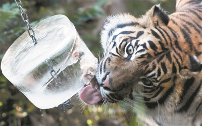 当地时间7月13日,意大利罗马,当地遭遇高温天气,一家动物园为动物们送上冰制食物,帮助它们解暑。图为老虎舔舐冰块降温。