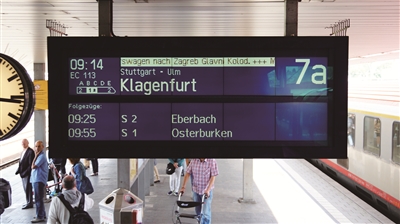 如果找不到同车旅客询问,自己看懂报站是最好的办法。几个常用坐火车的单词,比如Bahnhof是火车站的意思,Gl.是站台Gleis的缩写,abfahrt/ab是离站,ankunf/an是到站。你要记住目的地德语名字,每节车厢的显示屏都会显示下一站的站名,再留意预计到达时间,就八九不离十了。