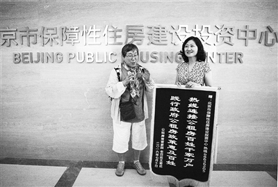 市保障性住房建设投资中心“明星租户”——燕保·常营家园7号楼66岁租户王菊花阿姨,上周来到位于玉泉路南的燕保大厦,将一面绣有“热线连接公租房百姓千家万户,践行政府公租房政策惠及百姓”的锦旗送到市投资中心何丹手中,表达她对市中心公租房管理团队热情、专业、细致、周到服务的深深敬意。