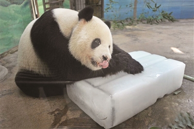 近日,武汉动物园,大熊猫“伟伟”趴在冰块上打盹、玩耍,直舔着舌头,憨萌可爱,吸引不少中外游客的目光。