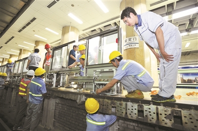 7月31日零时30分,地铁2号线首扇屏蔽门在安定门站试点安装。预计1、2号线屏蔽门最快将于2017年底完工。(相关报道详见第3版)