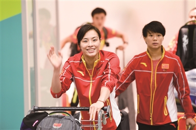 8月1日晨,中国跳水队运动员吴敏霞(前左)和队友抵达巴西里约国际机场。当日,参加里约奥运会的中国体育代表团一行抵达里约热内卢。