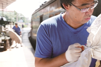 这些邮件大的重30至50多公斤,小的也有10几公斤。从车厢里把货物搬到行李车上,没把子力气不行。不一会儿,工人的汗水就湿透了衣襟。这时的车站温度是33度,车厢里的温度显示为38度,别说干活了,就是在车厢里待一会儿也是满头大汗。