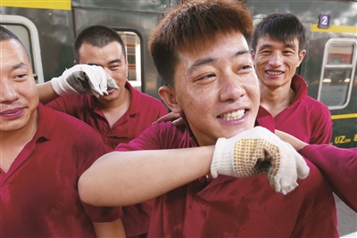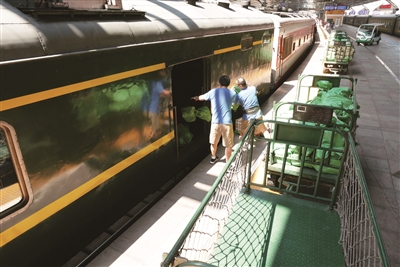 10时10分,转运员列队迎接从福州开往北京的列车,车刚一停稳他们就开始抓紧卸车。队长郑重说:“我们队有70多人,要负责4辆列车的装卸、分检,时间很紧”,说完他急忙和同事们一起干活去了。