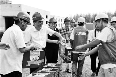 李国良说,慰问前,区总工会进行了大量走访工作,慰问对象均为工作条件艰苦,且是涉及密云区相关水源保护、新城“三起来”(让房前屋后亮起来,胡同巷道平起来,市容市貌美起来)等工作的企业。“希望‘送清凉’活动能带动全区各级工会组织纷纷行动起来,为职工防暑降温、安全生产做好服务。”图为一线职工喜获“清凉包”。王路曼 摄