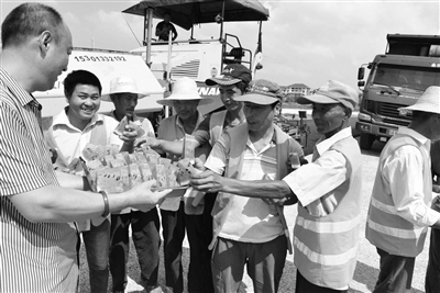 桑拿天“重启”。北京市政路桥总承包一部平谷泃河新城段治理工程建设者们正抓住有效工期进行路面摊铺。为保障施工人员顺利施工,总承包一部将解暑西瓜及时送进了工地。项目部还为每名职工准备了草帽,并规定现场实行轮班制,防止职工在烈日下暴晒时间过长。