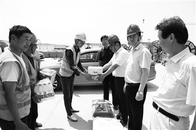 近日连续高温,北京城建十六公司领导班子来到新机场、中华保险等项目,向奋战在施工生产一线的工人发放了绿豆、白糖及防暑药品,给外施队伍送去了工会的温暖和夏日的清凉。通讯员 吕文龙 摄影报道